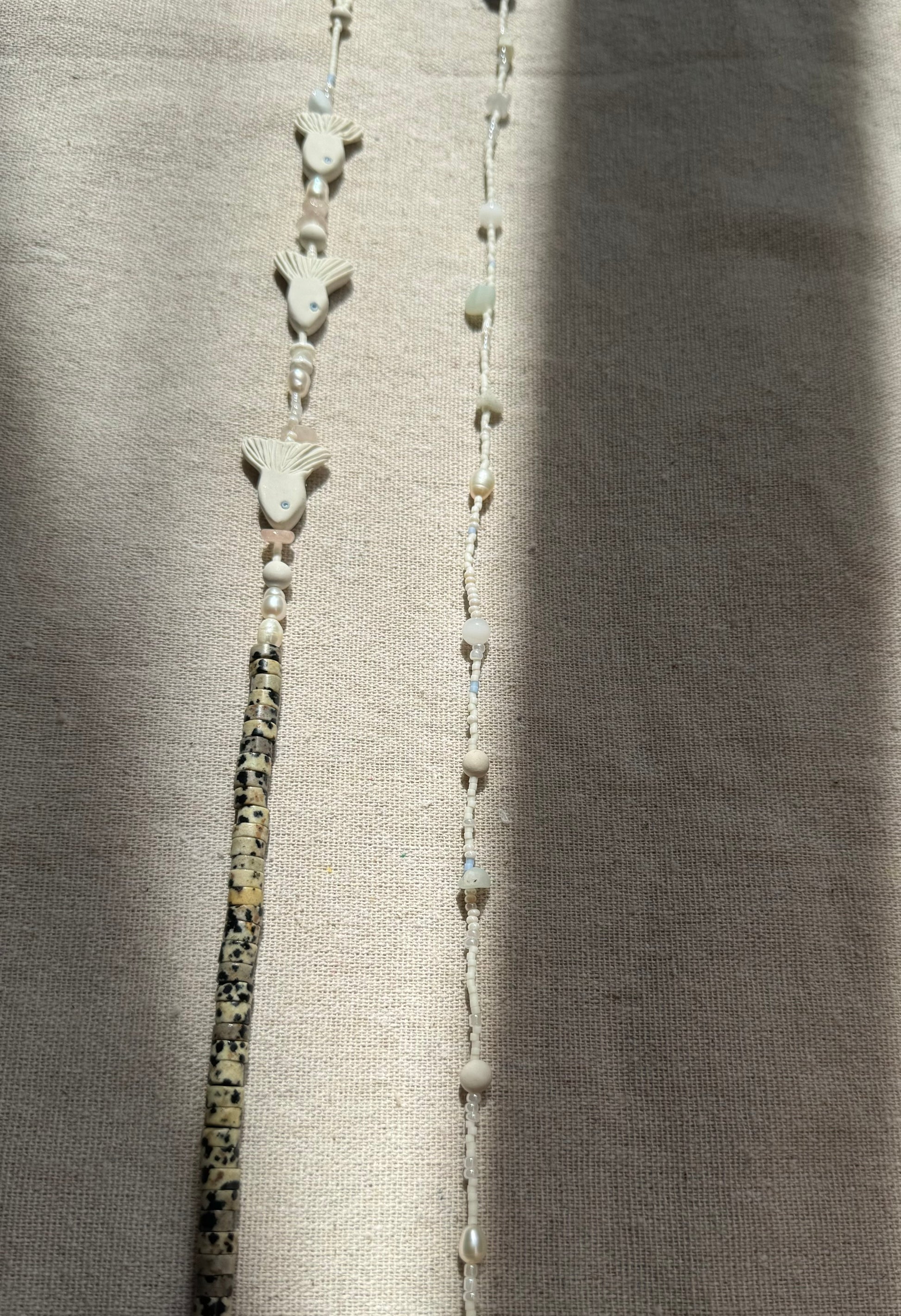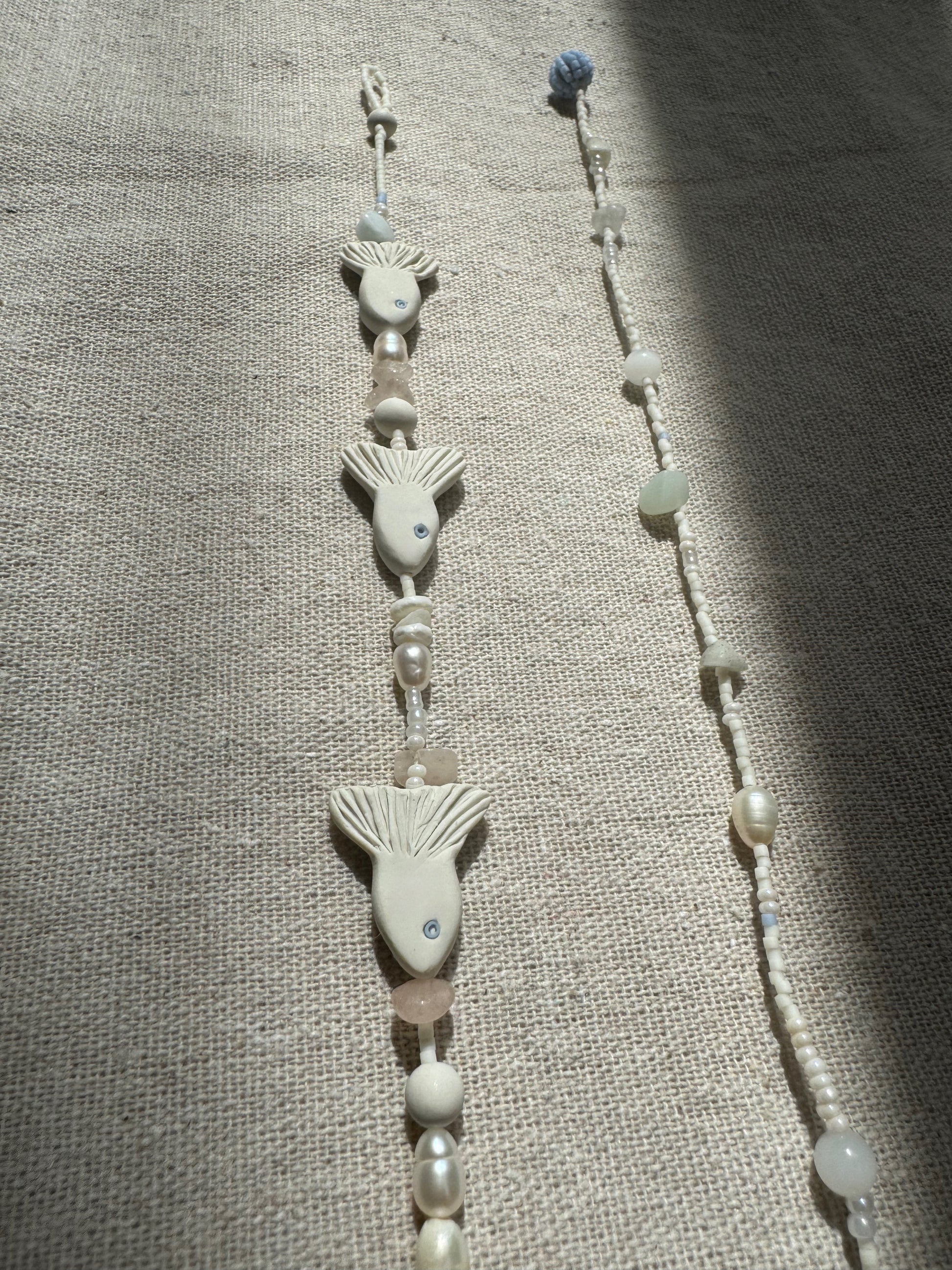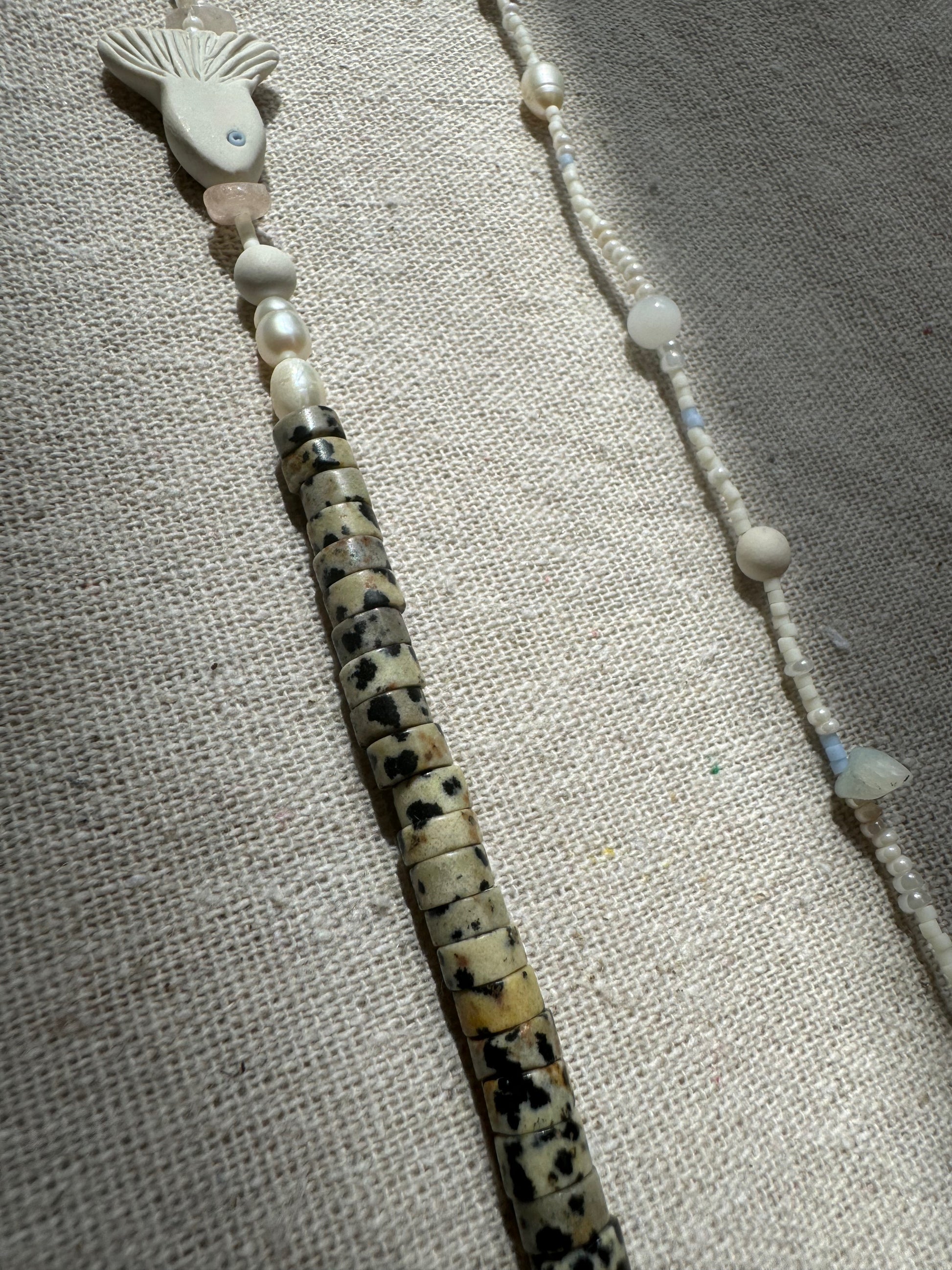 Long necklace of clay with pearls and natural stones, pieces of clay created by hand.