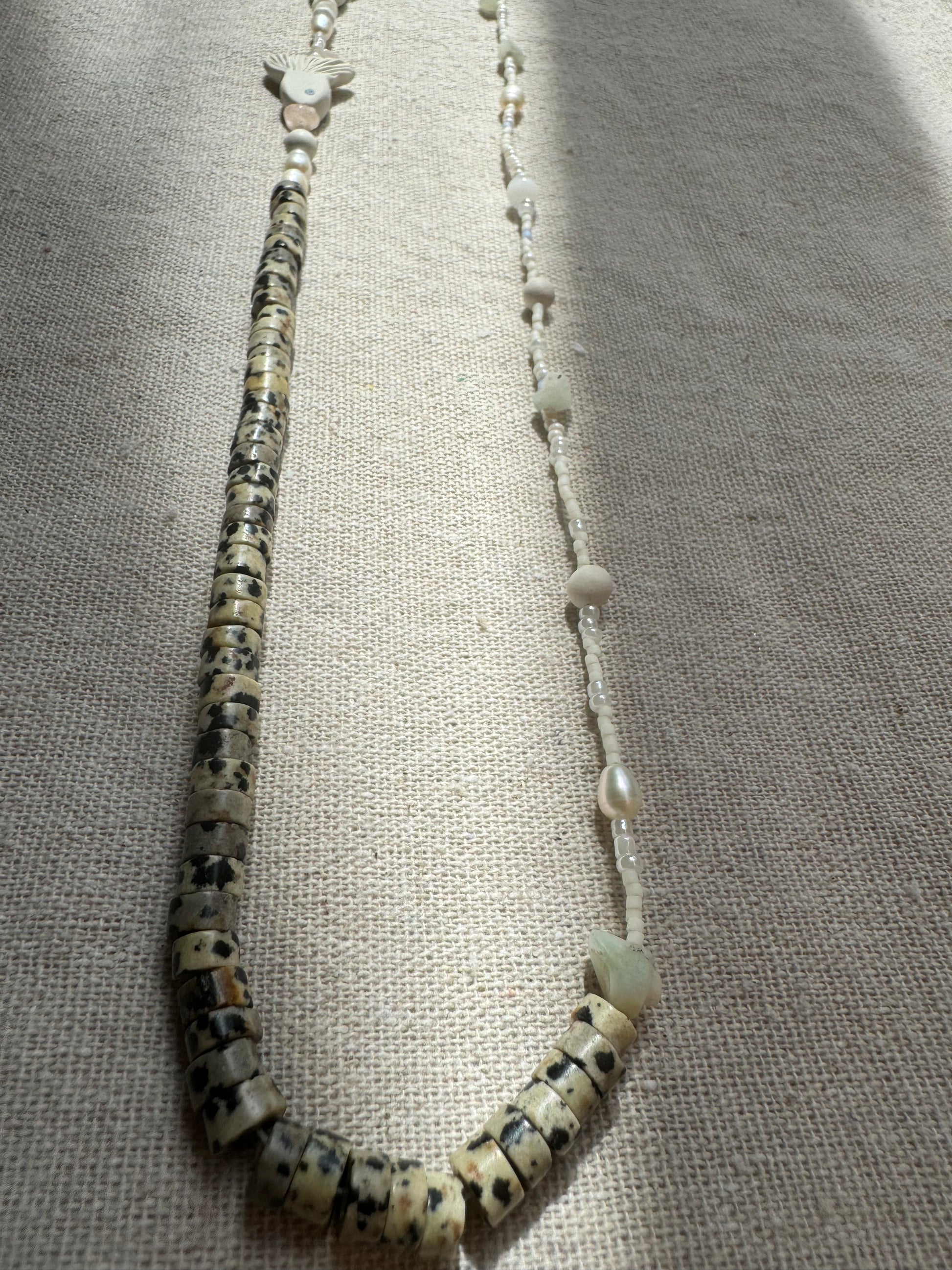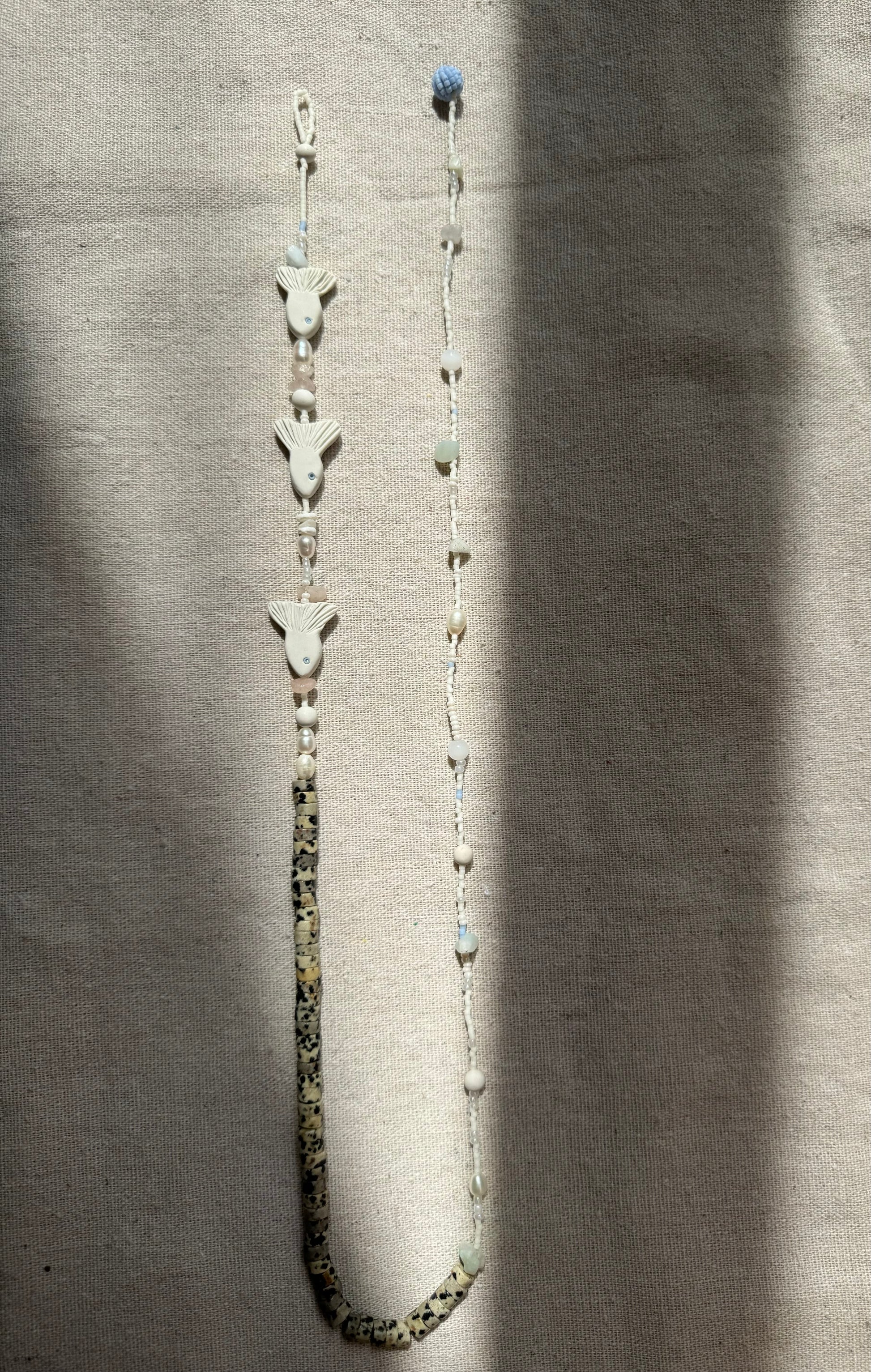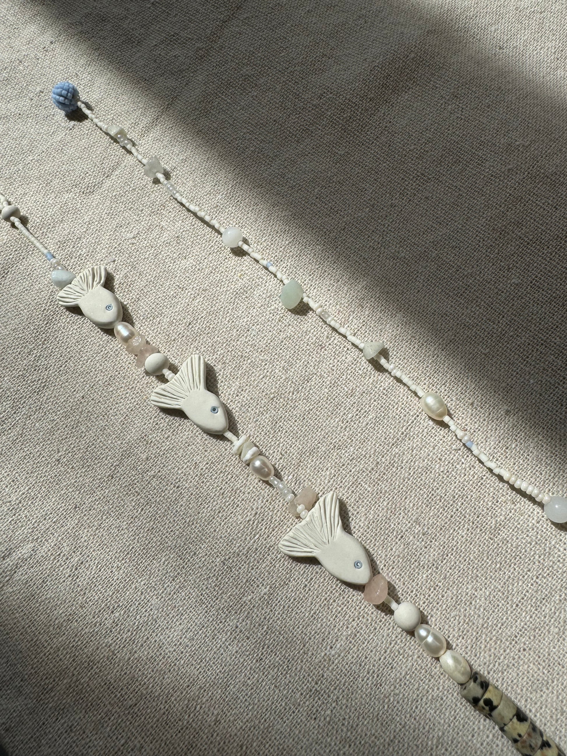 Long necklace of clay with pearls and natural stones, pieces of clay created by hand.