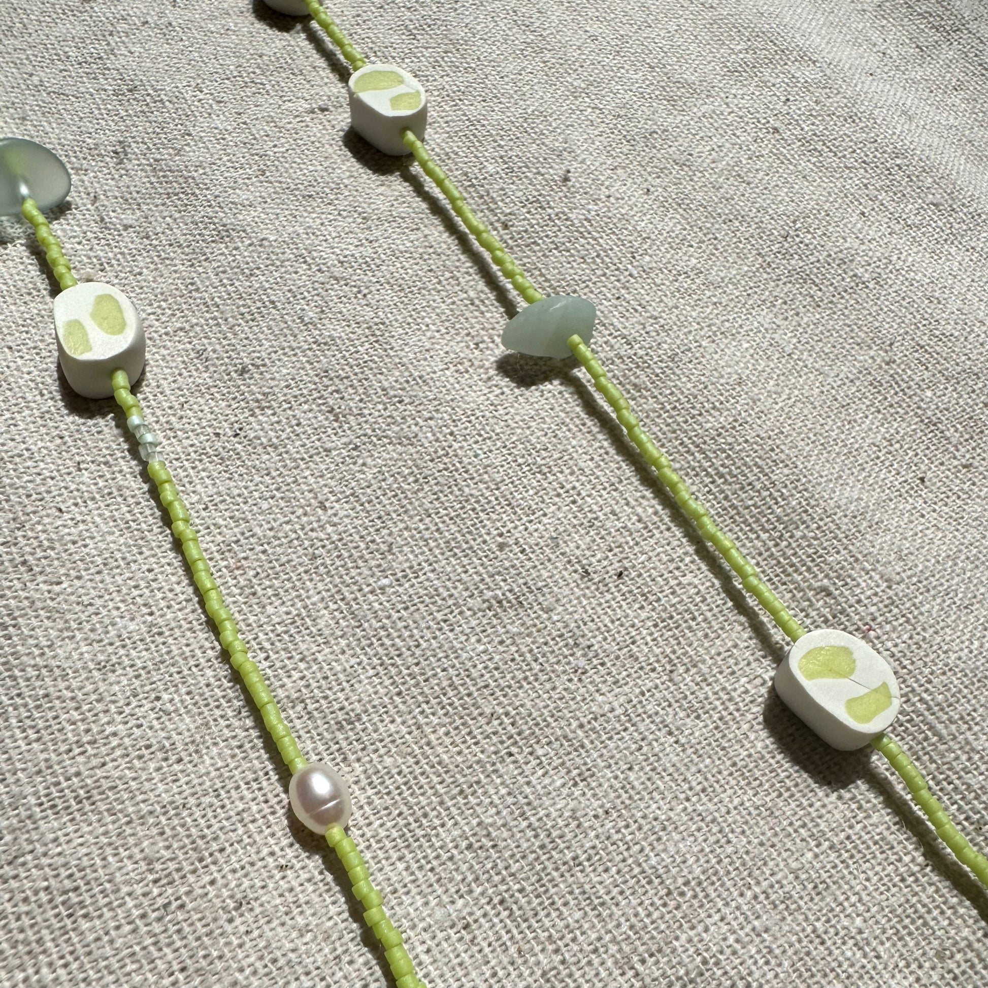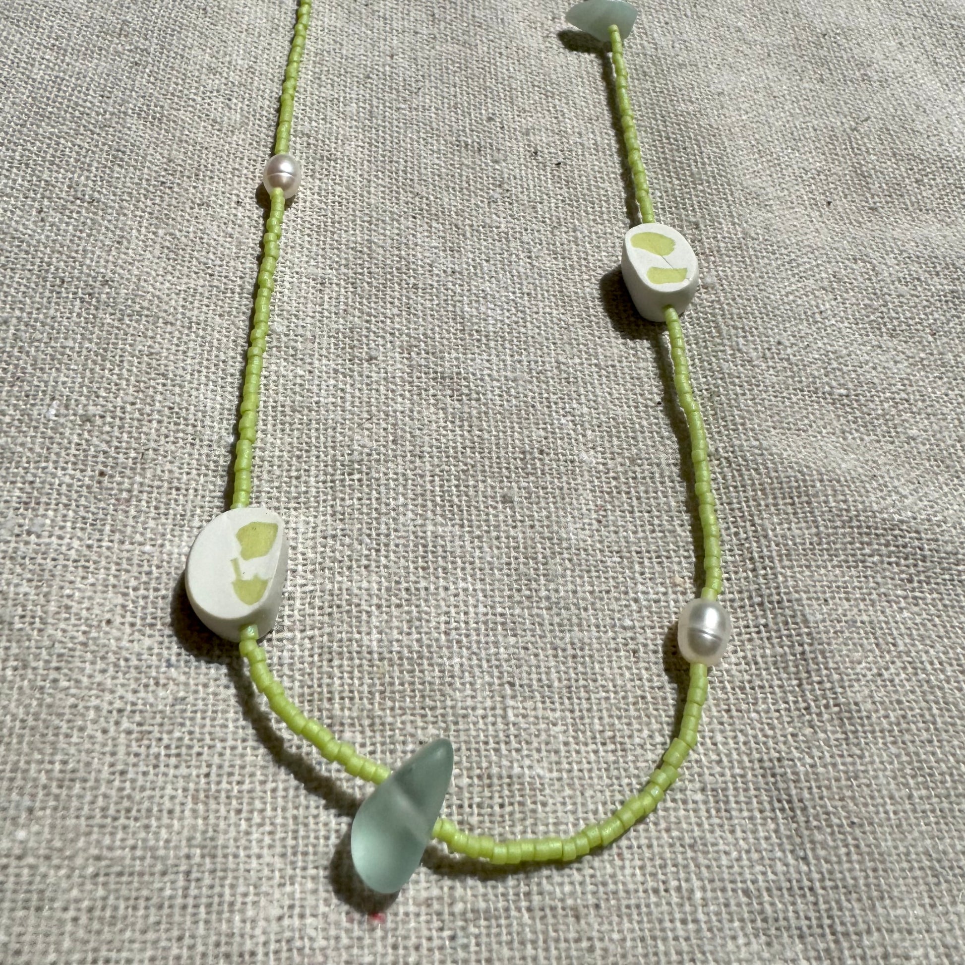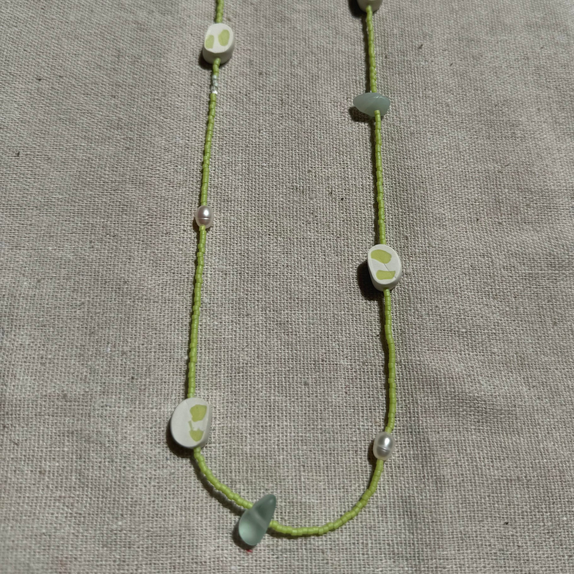 Beads made of white and green clay, with natural pearls and sea glass.