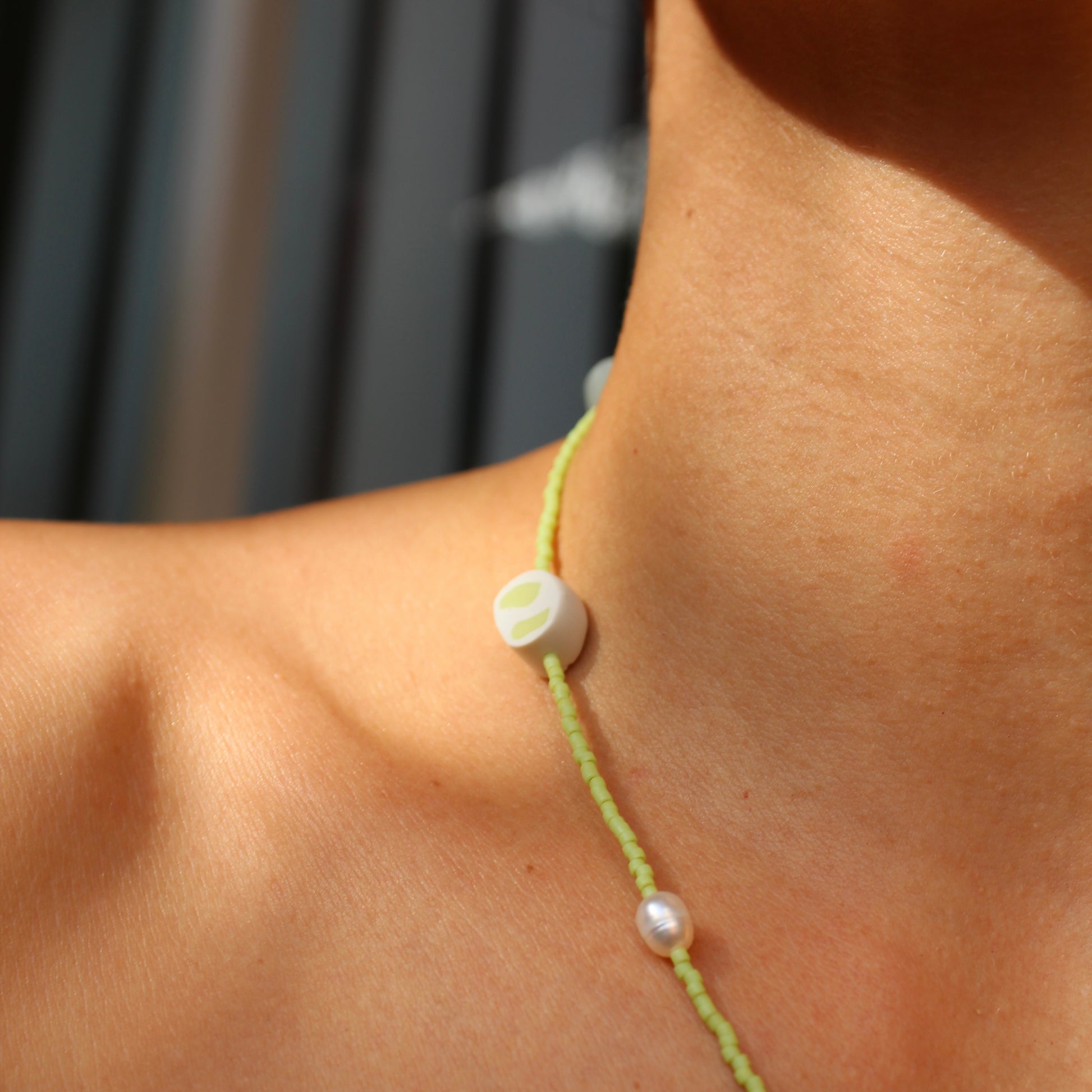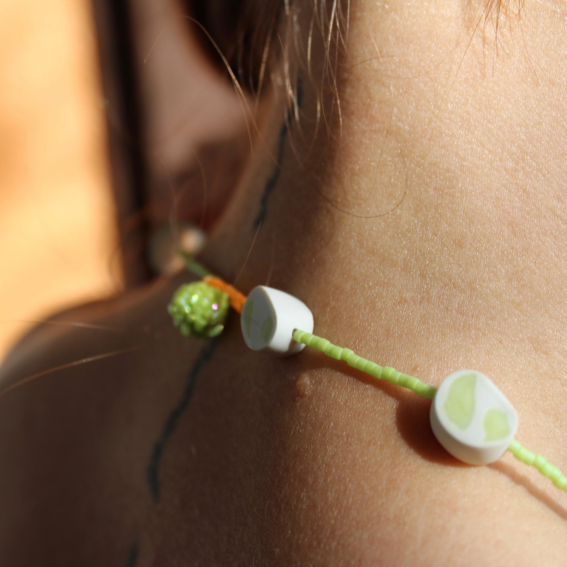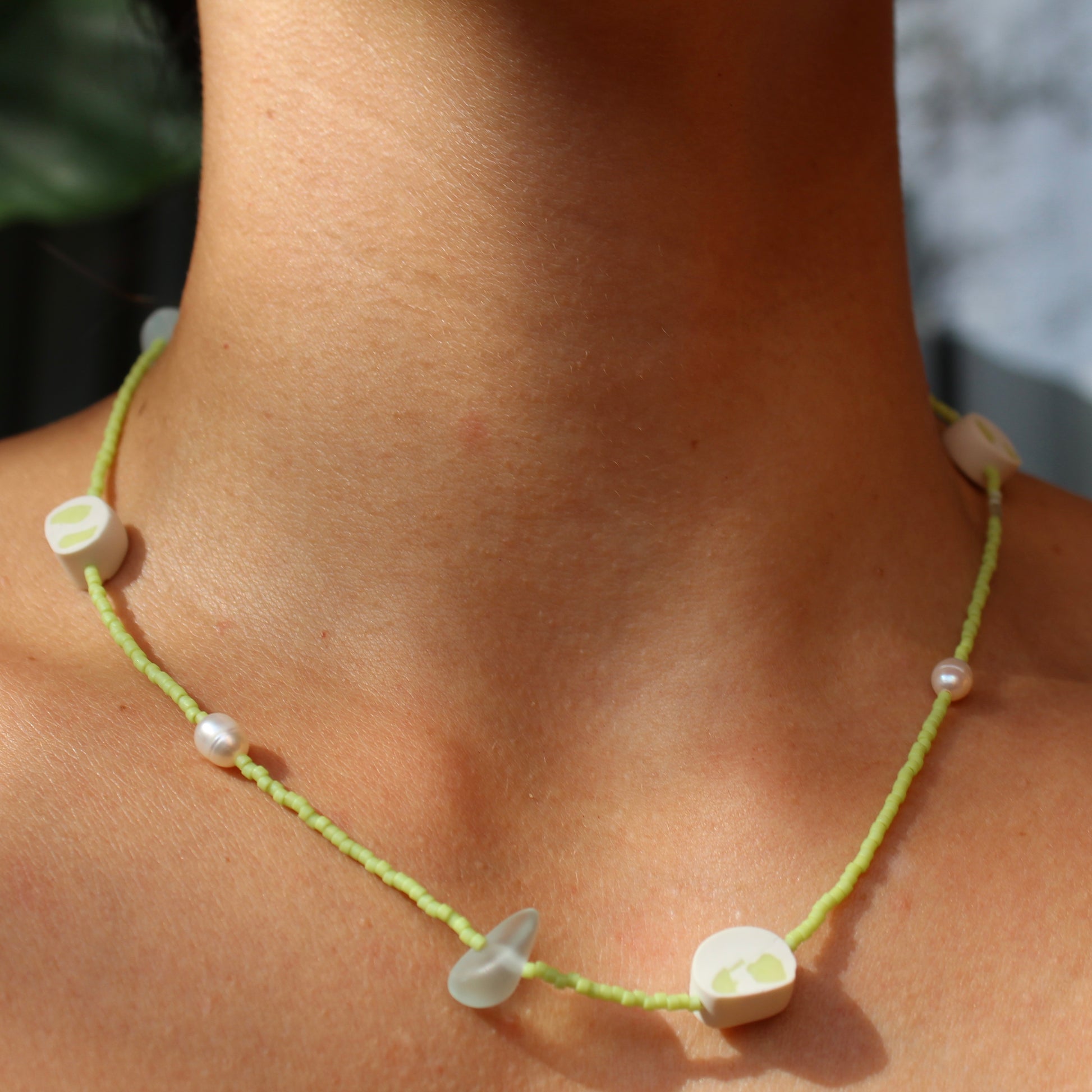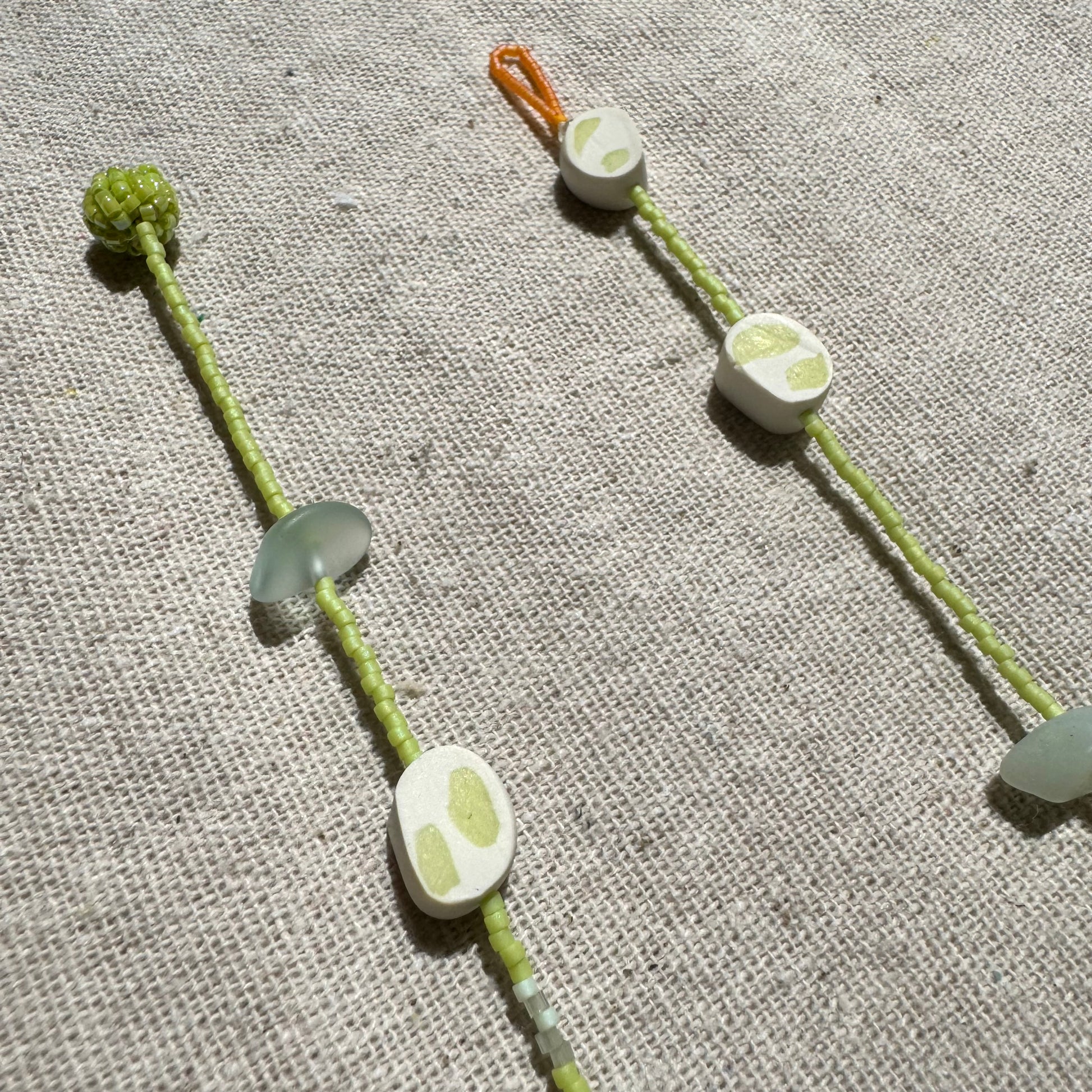 Beads made of white and green clay, with natural pearls and sea glass.